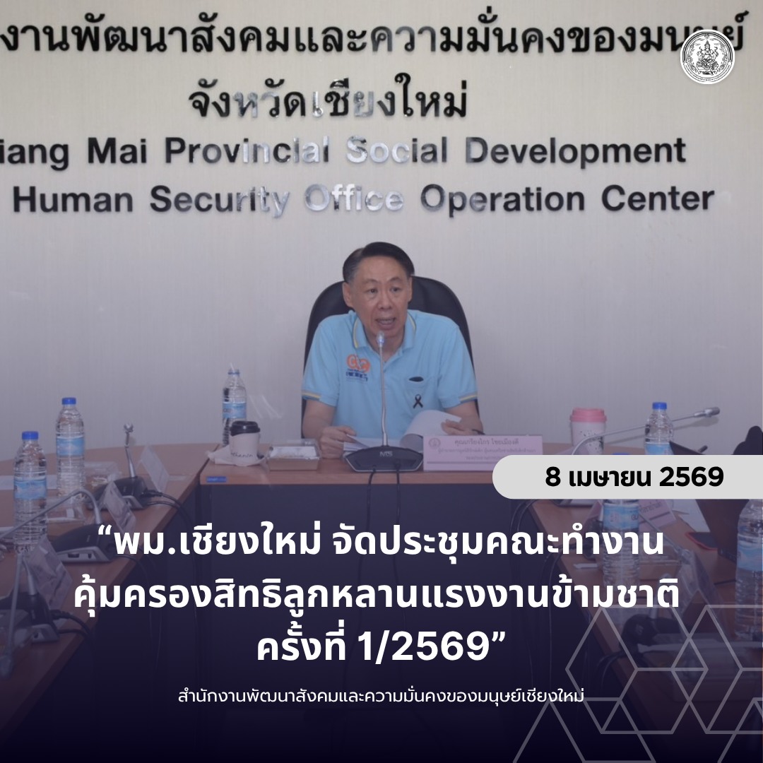 วันที่ 8 เมษายน 2569 สำนักงานพัฒนาสังคมและความมั่นคงของมนุษย์จังหวัดเชียงใหม่ ร่วมกับเครือข่ายภาคประชาสังคม จัดประชุมคณะทำงานคุ้มครองสิทธิลูกหลานแรงงานข้ามชาติจังหวัดเชียงใหม่ ครั้งที่ 1/2569